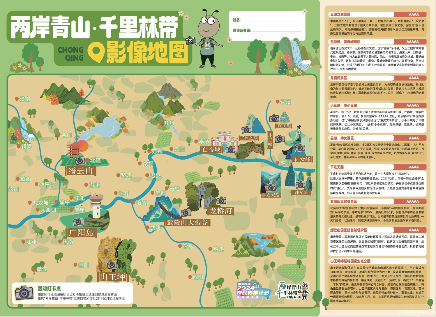 值得一提的是,本次专题影像大赛主办方还根据“两岸青山·千里林带”三类四带所涉及的28个区县(万州、涪陵、渝中、大渡口、江北、沙坪坝、九龙坡、南岸、北碚、渝北、巴南、长寿、江津、合川、永川、铜梁、潼南、开州、武隆、丰都、忠县、云阳、奉节、巫山、巫溪、石柱、酉阳、彭水),推出了一张“‘两岸青山·千里林带’影像地图”,市民可以手持这张地图,到地图指引的打卡点进行拍摄,获得地图权益与拍摄最佳机位。大家可以从“市民影像计划”微信公众号获取具体领取方式。